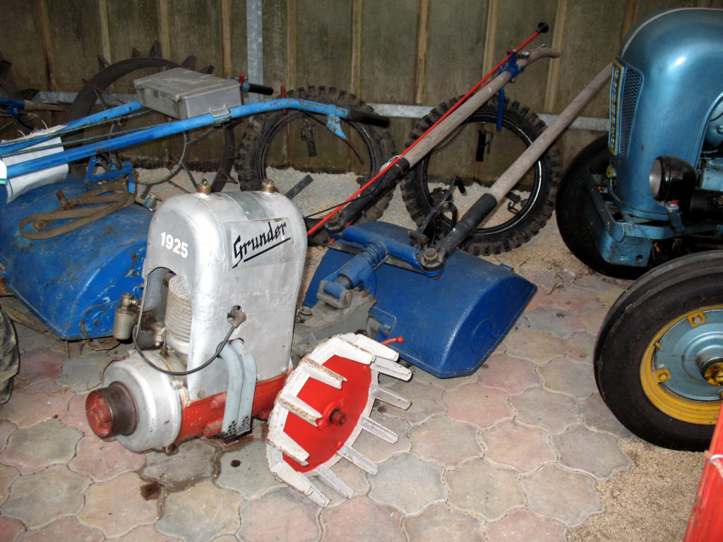 Georg Jäggin hatte einige Motorhacken aus den Jahren 1922-1925 in seiner riesigen Sammlung, die Ähnlichkeit mit dieser Bodenfräse aufweisen, jedoch den eigenen Grunder-Zweitaktmotor haben.