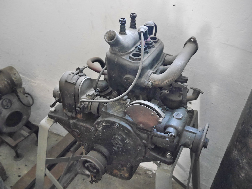 Siemens & Halske Zweizylinder Verbrennungsmotor, Type 92642, Nr. 9388. Diese wurden im ersten Weltkrieg u.a. zur Stromversorgung von Fliegergefechtsstationen, Scheinwerferbatterien und als Hilfsaggregate von Luftschiffen verwendet.