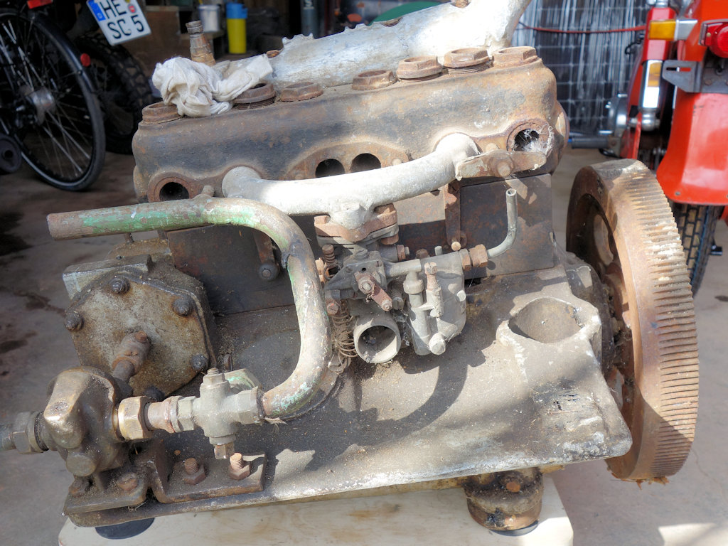 Herfried Wichern hat kürzlich diesen Siemens M4-Motor, Nr. 1379, gekauft und will versuchen, ihn wieder lauffähig zu machen. Der Motor, vermutlich von 1914, ist offensichtlich mal zum Bootsmotor umgebaut worden. Er wurde anscheinend fachmännisch auf einen Zenith-Vergaser umgerüstet und es wurde eine Kühlwasserpumpe anstelle des Reglers montiert.
