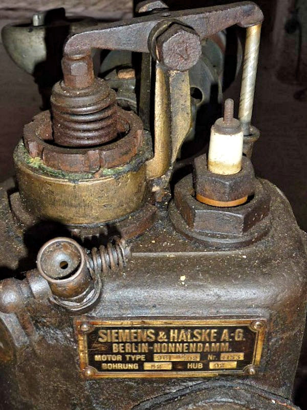 Detlef Bokker hat diesen Siemens-Motor in seiner Sammlung. Auf der Typenplatte steht: "SIEMENS & HALSKE AG, SIEMENSSTADT bei BERLIN, Motor-Type 961 82/92, Nr. 4129, Bohrung 82, Hub 92." Detlef sucht näheren Informationen zu seinem Motor, so möchte er die Alter und den Verwendungszweck des Motors erfahren. Da der Motor Wassergekühlt ist und am Schwungrad eine Kolbenpumpe besitzt, kann er sich vorstellen, dass er als Bootsmotor eingesetzt war.